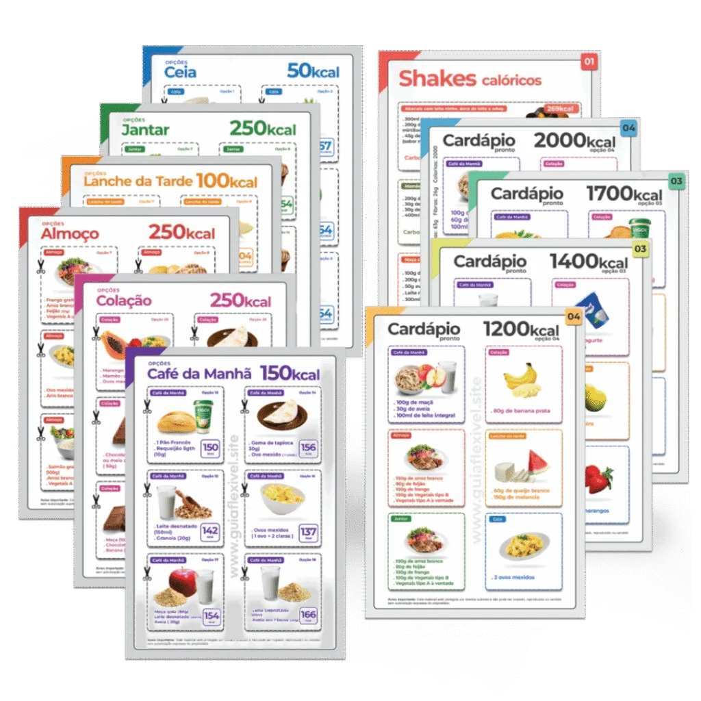Um pacote completo com Diversas Opções de Cardápios Prontos, Divididos em Café da manhã, Almoço, Lanche e Jantar, com calorias e macro nutrientes já calculados.